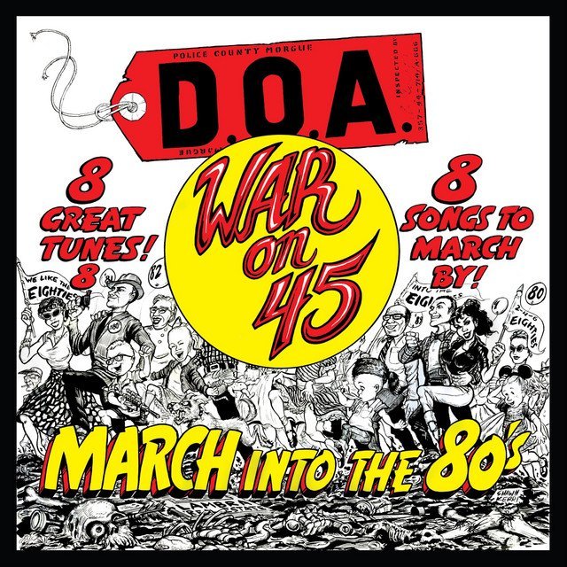In 1982, D.O.A. was ready to record a new album on the heels of their first two albums: Something Better Change and Hardcore ’81, which are still both musical landmarks to this day. But their legendary line up had changed, as Randy Rampage was ousted from the band. Chuck Biscuits’ older brother Dimwit Biscuits stepped in on bass with Chuck still on drums, Joey Shithead on vocals and guitar and Dave Gregg on guitar. While this line up only lasted for three months, the band traveled to L.A. and recorded demos at Mystic Studios. Eventually Chuck quit, Dimwit took over on drums and Wimpy Roy became the bassist. So, as a grand way of celebrating the 40th Anniversary of War On 45, which many a critic and fan hailed as one of the most innovative albums of its time and on a par, quality wise with their first two albums. Sudden Death decided to add some bonus material. First off, now included is a 12-page booklet of unique photos, posters and an extensive history of D.O.A. at that time, written by Canada’s godfather of punk Joey Shithead. Also, All eight tracks from the War On 45 1982 release are on side A and seven tracks from the pre-War On 45 demos that were recorded at Mystic onto Side B. So one has the Montgomery brothers: Biscuits and Dimwit, two of the greatest drummers of all time on the same LP. All in all, this album will hit one hard, the way D.O.A. always has and it sums up one the best eras of these world renowned punk pioneers.